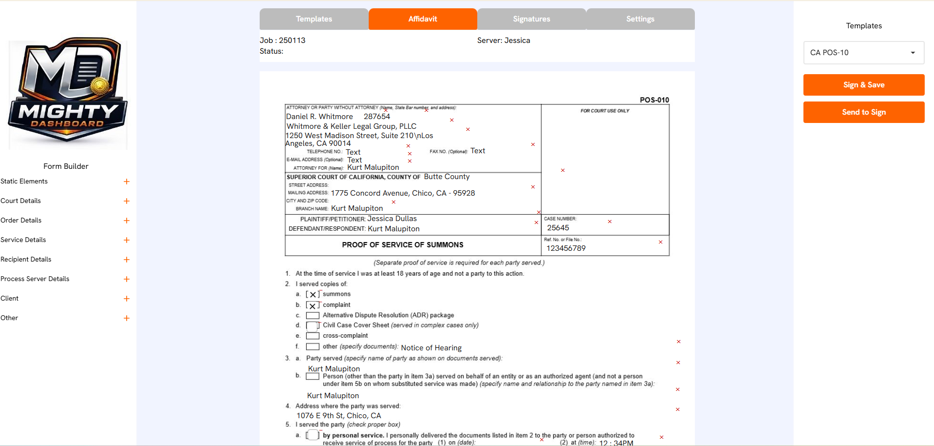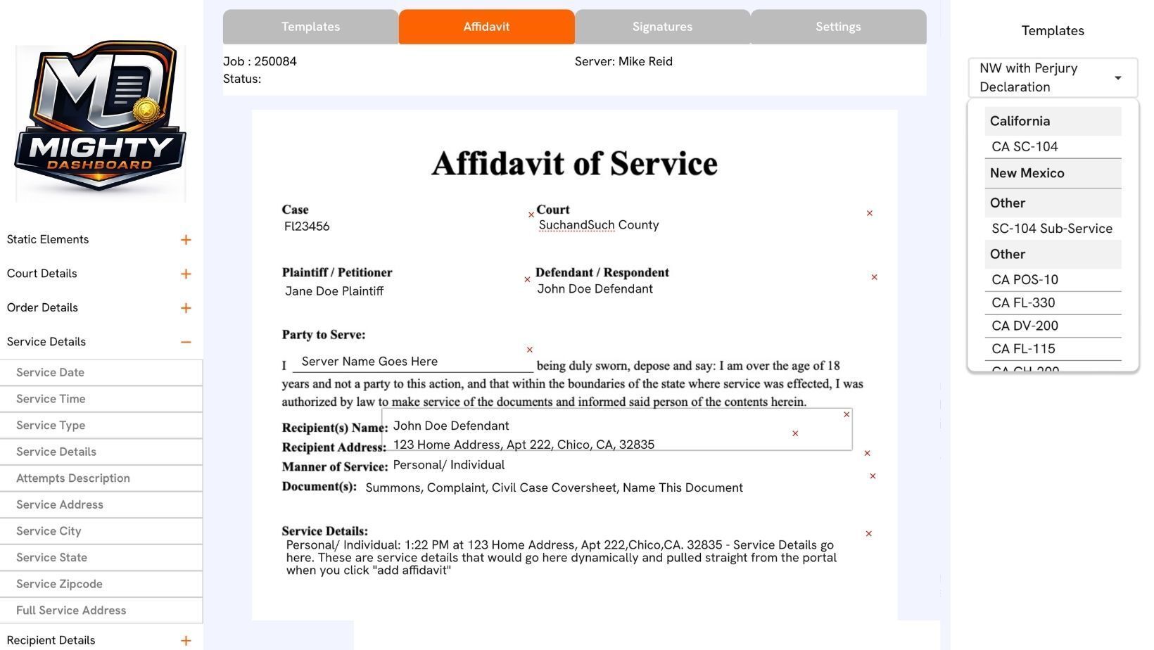 Yes. Mighty Dashboard provides a powerful library of affidavit and document templates. These templates automatically merge job data, case details, and service information into professional documents that can be signed, shared, printed, or emailed. You can even upload your very own custom PDF and map out where you want the data to appear on the document. We're here to help if you get stuck.