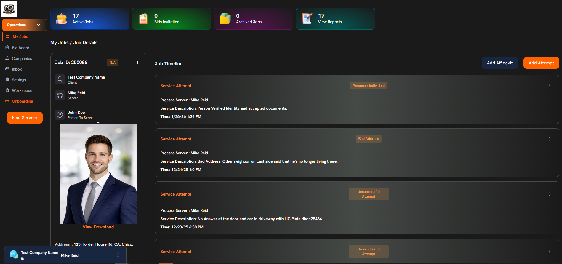 Stay informed at every step with seamless in-app messaging and live job timelines. Communicate directly with servers, view attempts, updates, and outcomes-all in one place.